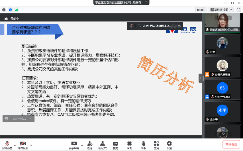 最后,李经理为大家介绍了翻译行业从业人员所需的培训流程、翻译职位的晋升空间、翻译的评估流程以及翻译的整个过程。