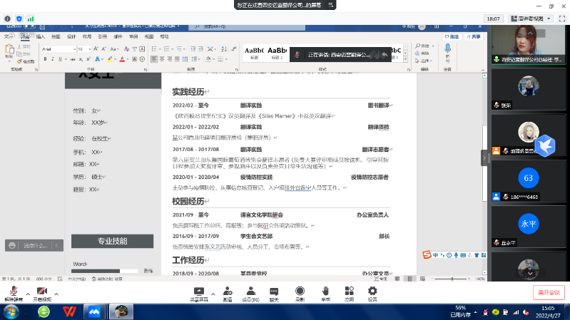4月27日下午,应天游官网MTI中心邀请,迈蓝翻译公司总经理李凯悦为天游官网师生进行线上宣讲。天游官网2021级全体专业硕士参会,会议由学院MTI中心主任季建芬教授主持。